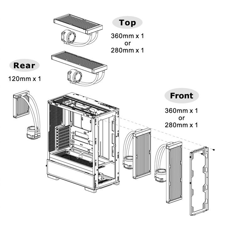 Top Side(AIO) : 1 x 360mm, 1 x 240mm, 1 x 120mm 1 x 280mm, 1 x 140mm Front Side(AIO) : 1 x 360mm, 1 x 240mm, 1 x 120mm 1 x 280mm, 1 x 140mm Rear Side(AIO): 1 x 120mm |