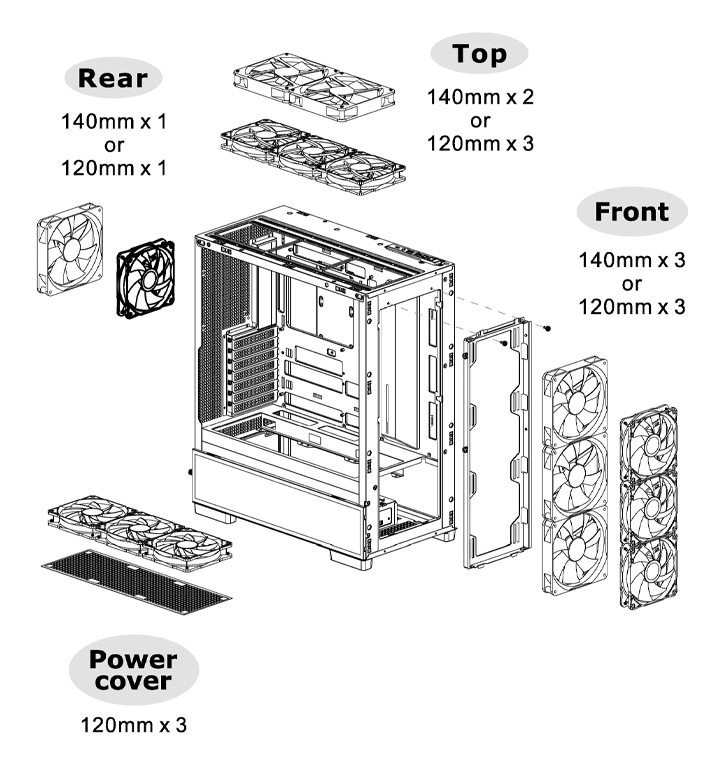 Top: 3 x 120mm, 2 x 120mm, 1 x 120mm 2 x 140mm, 1 x 140mm Front: 3 x 120mm, 2 x 120mm, 1 x 120mm 3 x 140 mm, 2 x 140mm, 1 x 140mm Rear: 1 x 120mm 1 x 140mm Power Cover: 3 x 120mm, 2 x 120mm, 1 x 120mm |